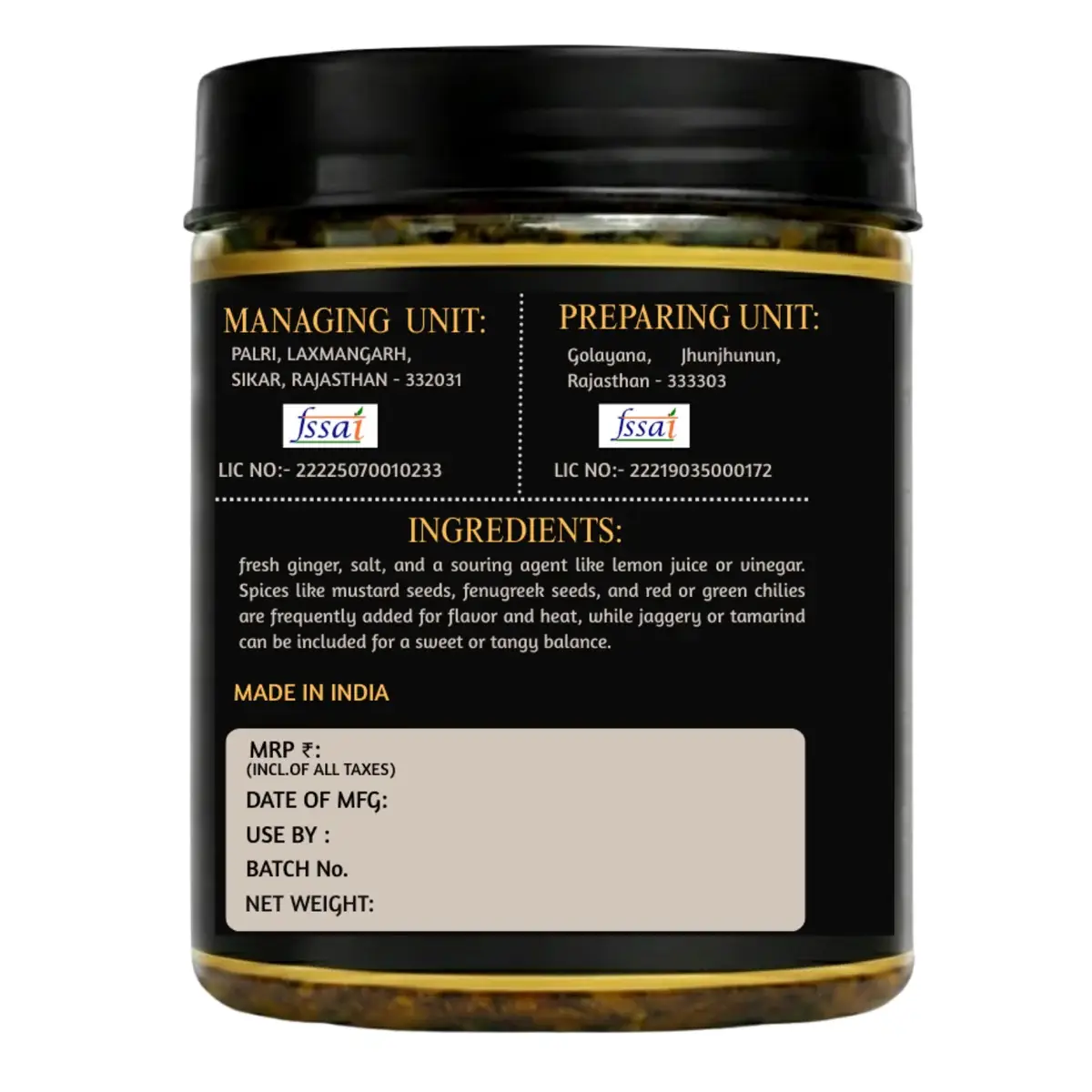 This traditional preparation is made from fresh ginger pieces combined with mustard oil and selected Indian spices. It offers a warm, slightly pungent taste with a balanced spicy and tangy flavor that works well with daily meals.