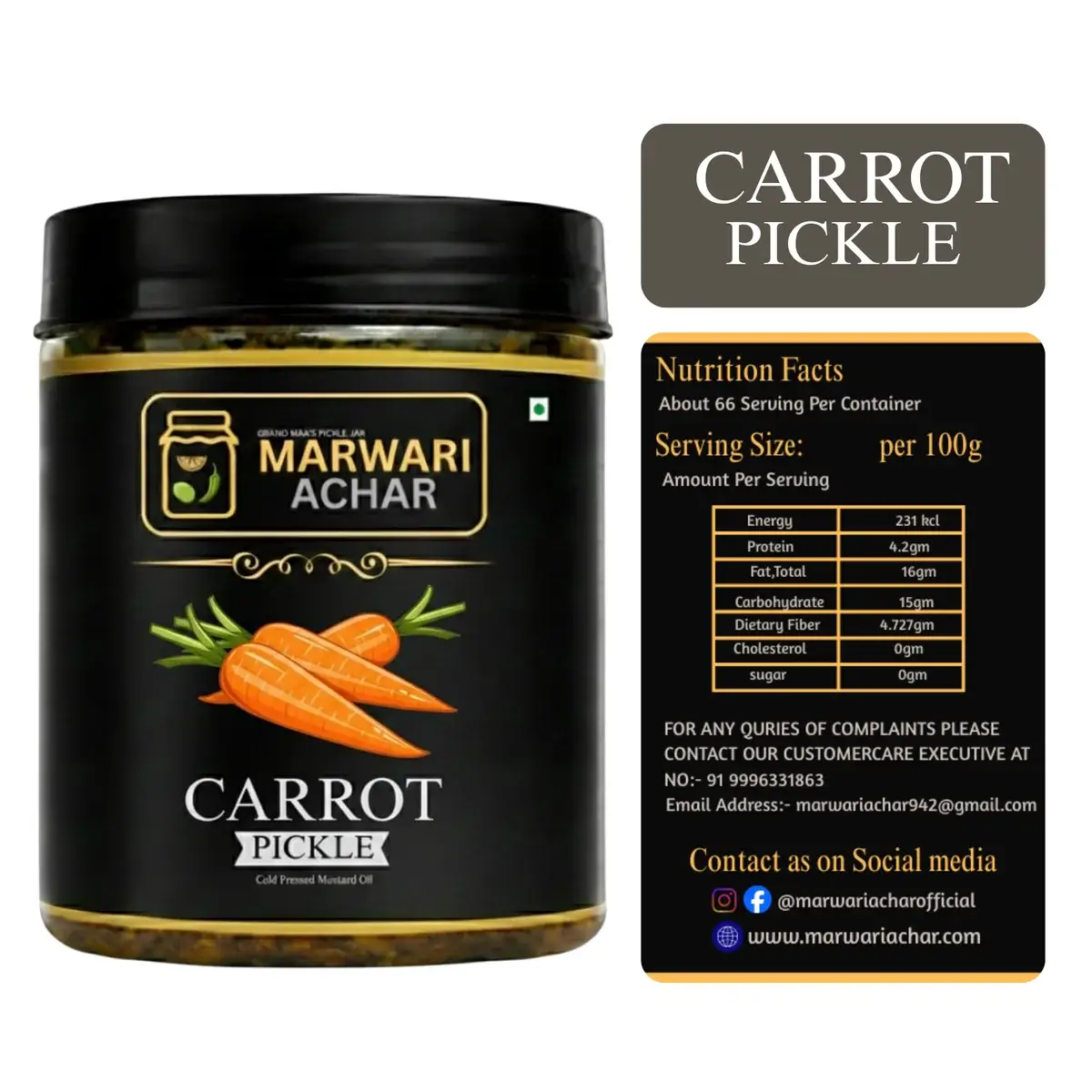 Looking to buy authentic Carrot Pickle online? Marwari Achar brings you a traditional gajar preparation made using fresh carrots, cold pressed mustard oil, and hand-blended Indian spices for real homemade taste.