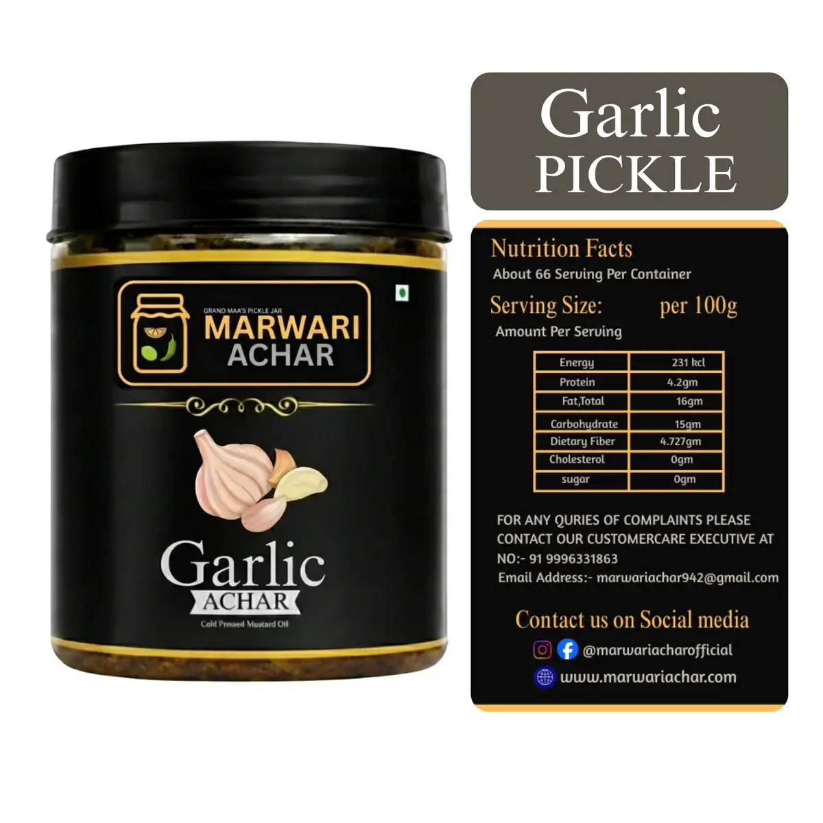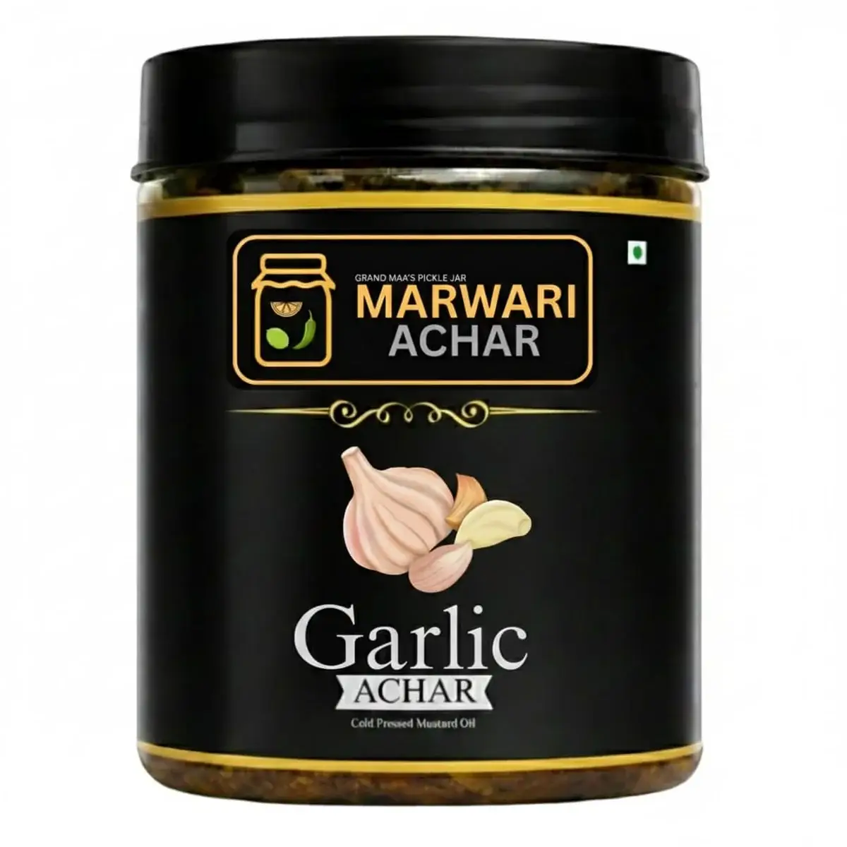 Garlic Pickle is a traditional Indian preparation made using fresh garlic cloves blended with mustard oil and a balanced mix of spices. This classic achar delivers a deep savory taste with spicy and slightly tangy notes, making it a popular accompaniment in Indian meals.